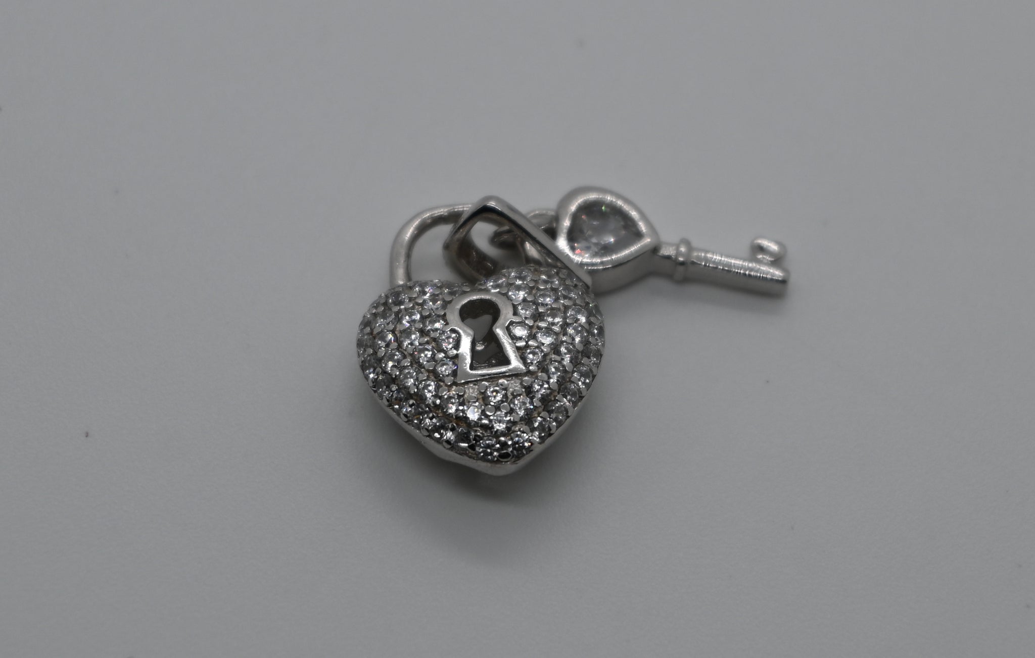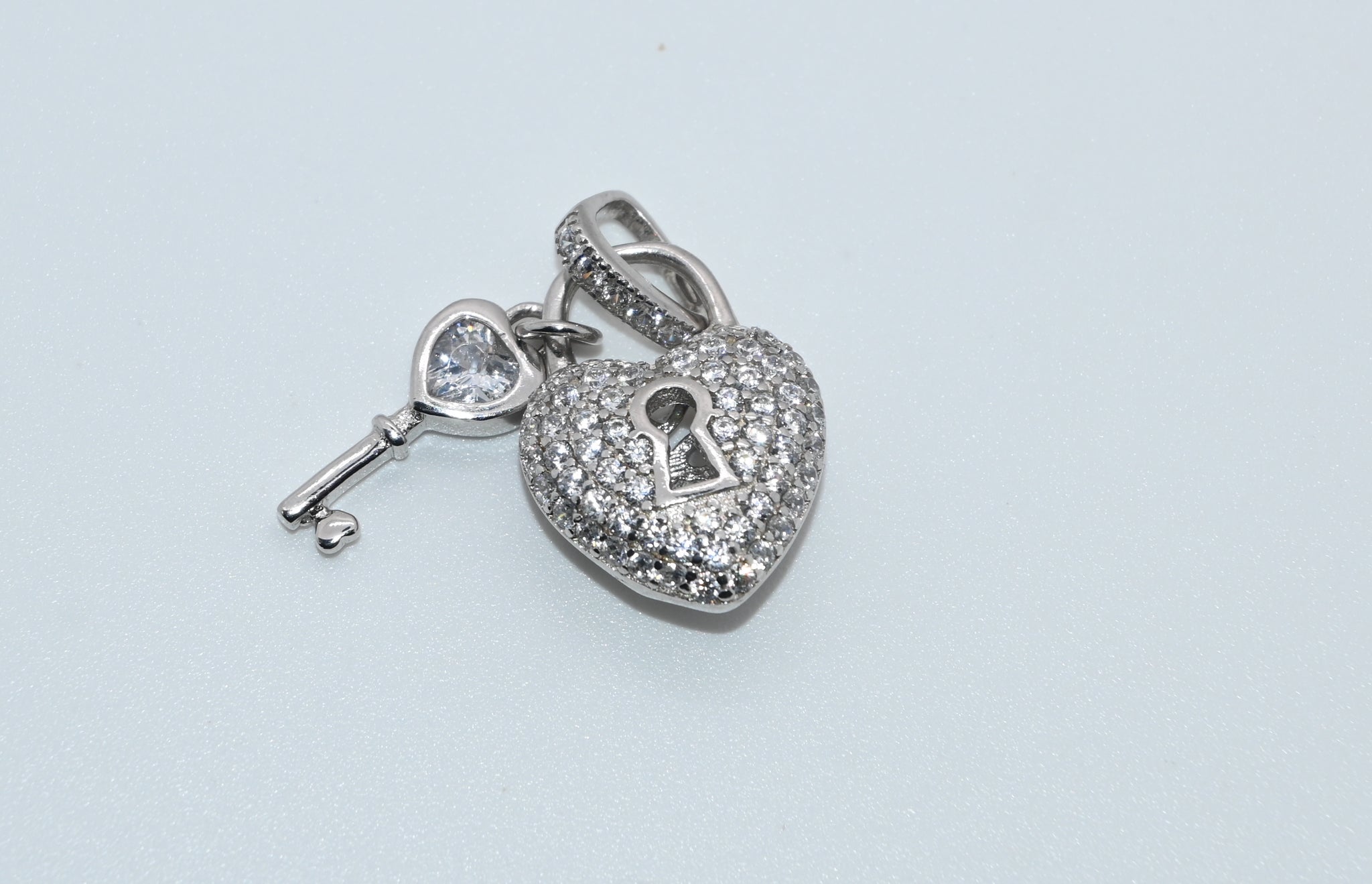 Custom 925 rhodium silver cz heart shaped lock with key, beautiful attention to detail. With a nice shine to complement anyone who wears this piece-of-art.